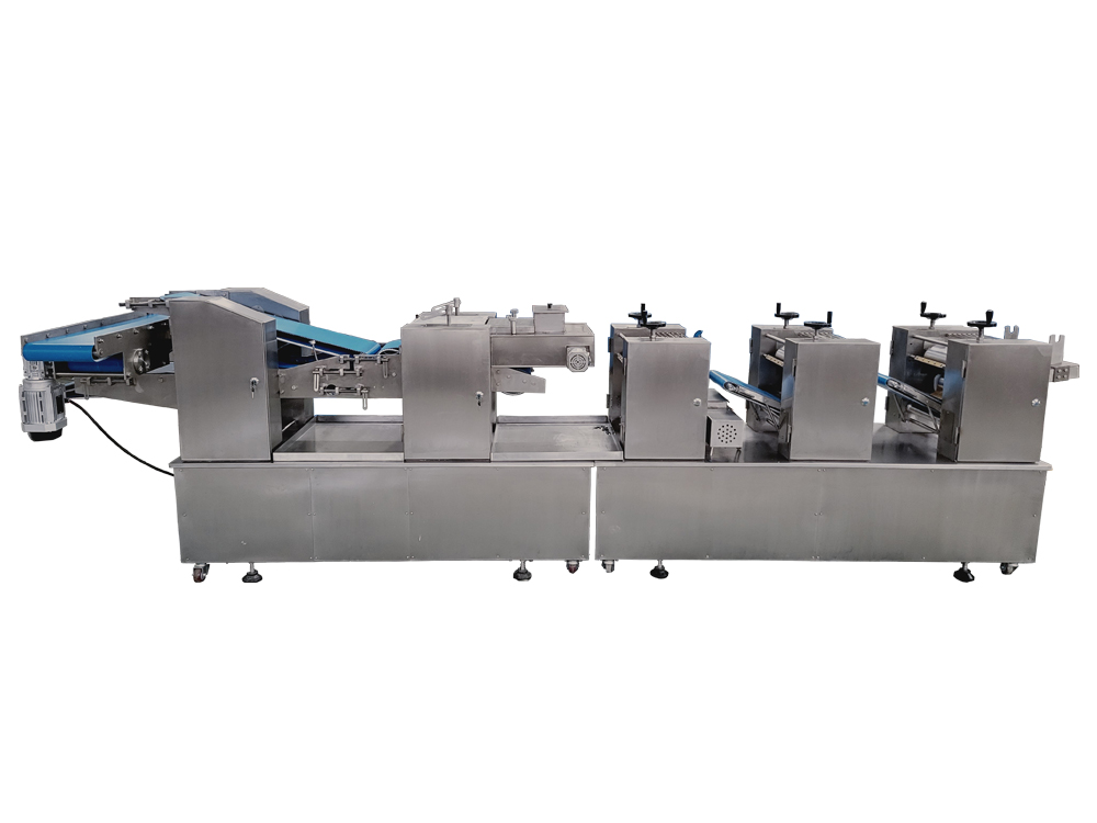 3、設(shè)備為變頻控制,每一道壓輥都采用單機(jī)驅(qū)動(dòng),通過(guò)測(cè)距傳感器,實(shí)現(xiàn)自動(dòng)面帶張緊控制,多輥聯(lián)動(dòng)??焖佥p松地制作大量面皮,提高生產(chǎn)效率。