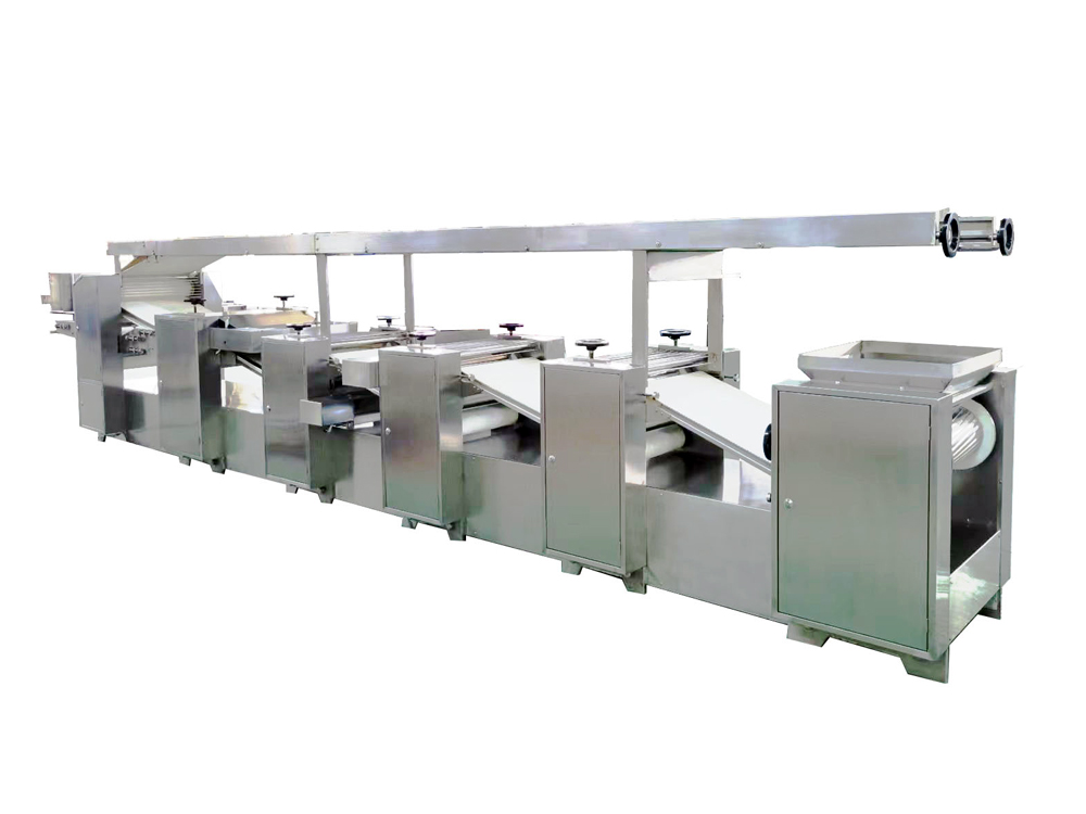 3、設(shè)備為變頻控制,每一道壓輥都采用單機(jī)驅(qū)動(dòng),通過測(cè)距傳感器,實(shí)現(xiàn)自動(dòng)面帶張緊控制,多輥聯(lián)動(dòng)??焖佥p松地制作大量面皮,提高生產(chǎn)效率。